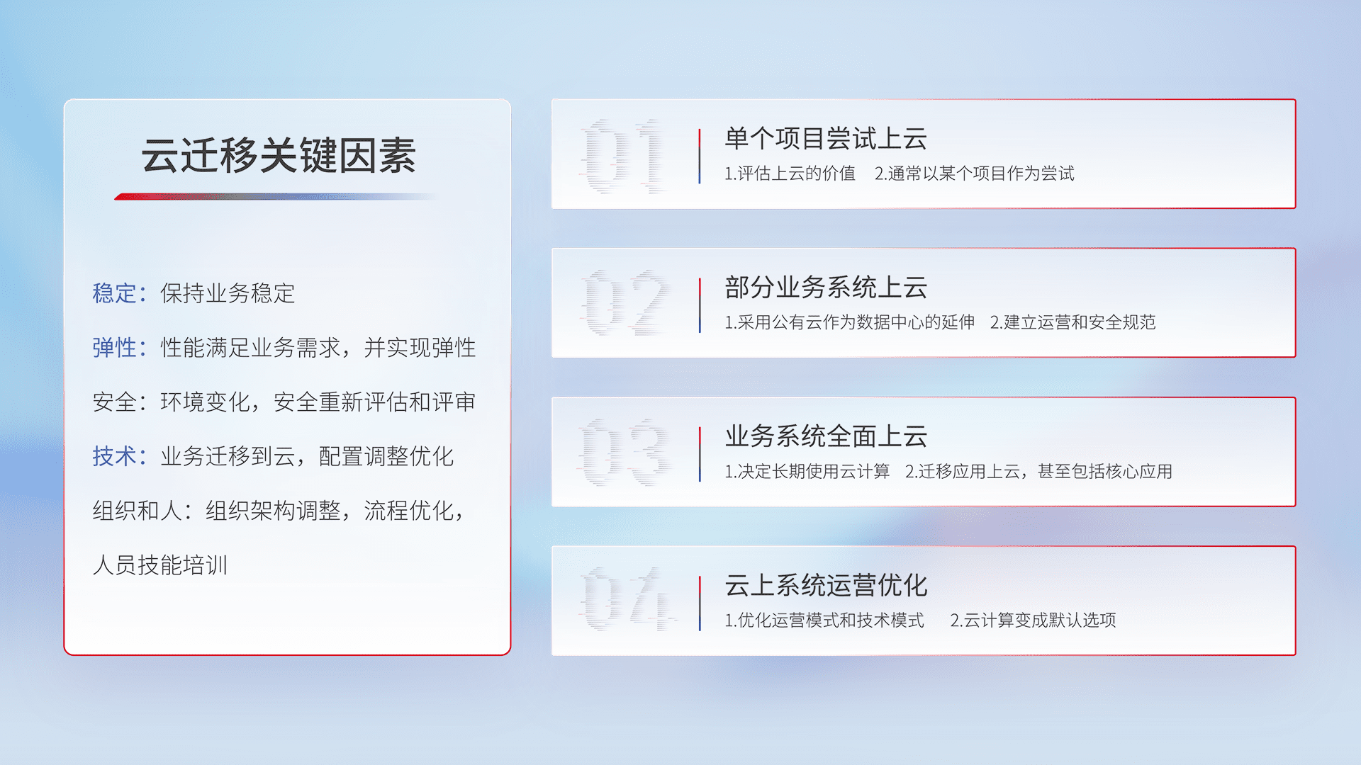 结合实际业务,,,,从规划设计、、、、云平台选型、、、云原生改造、、、数据迁移、、、集成交付,,,,迁移全过程为客户识别最佳上云路径,,,,做好风险识别管理,,,,设计网络架构、、、、身份权限、、、、安全审计合规、、、、操作审计、、、、日志审计、、、监控告警策略、、多站点容灾设计等,,,对云上基础设施进行整体规划,,,提升IT治理水平,,以满足弹性、、高可用、、、、高性能的需求。。