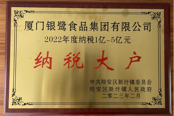 会上还举行了新圩镇纳税大户表彰仪式,,翔安区委常委、、、、副区长郭三温为厦门z6com·尊龙凯时食品集团有限公司授予“翔安区新圩镇2022年度纳税大户”奖牌。。
